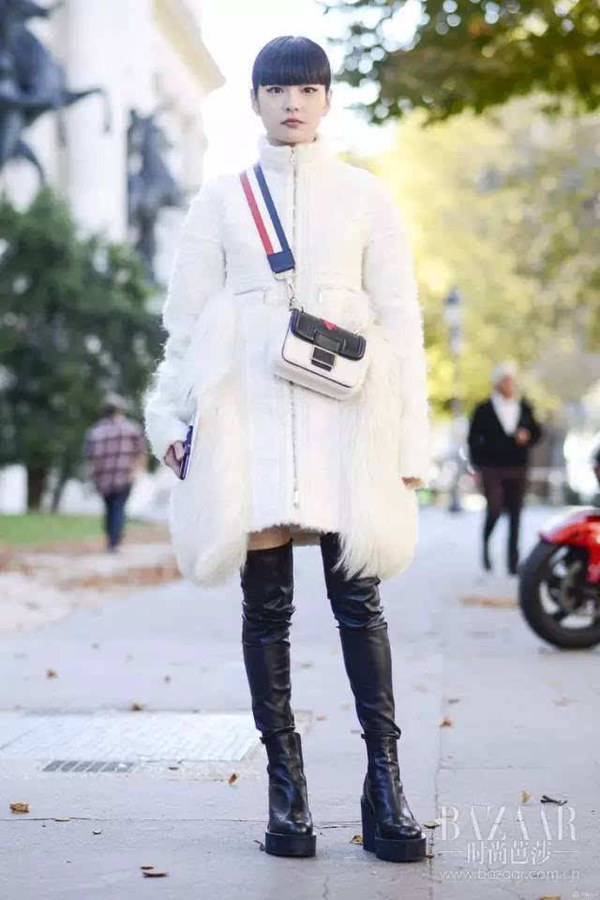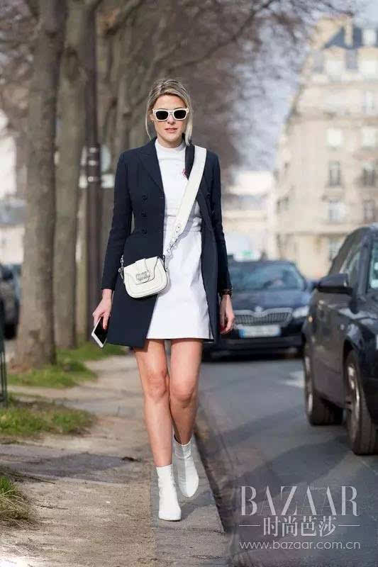 馬蹄形搭扣小包與整套look的白色內搭連衣裙還有白色短靴相呼應,大氣穩重