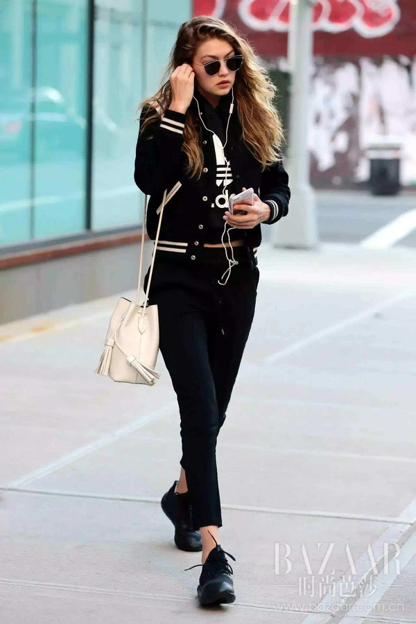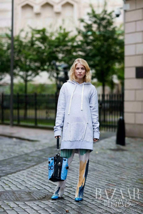 黑藍撞色的冷色系水桶包、休閑的衛衣還有印花闊腿褲的混搭顯得氣場更強大