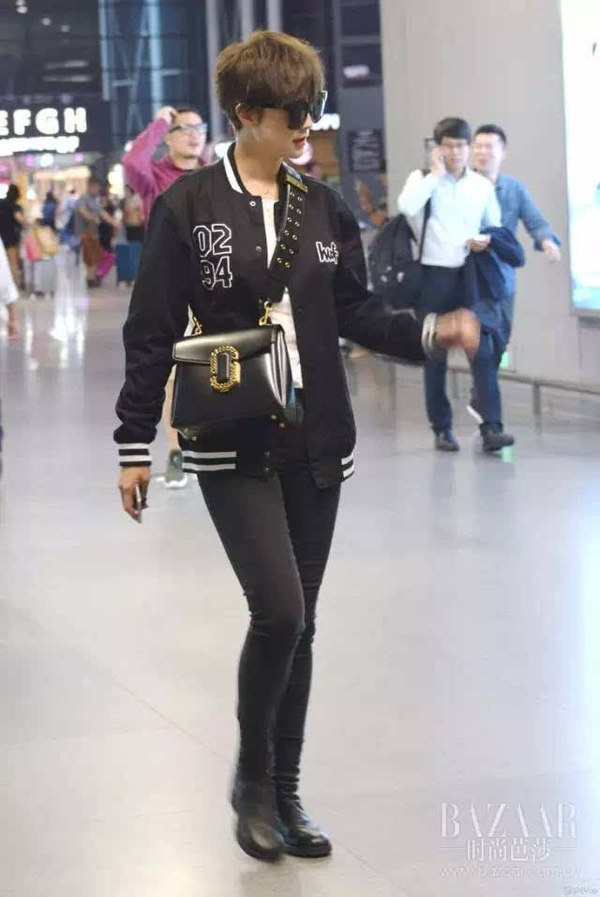 棒球外套配窄腿和短靴,背上Marc Jacobs搭扣包,小宋佳這身酷酷的造型簡直迷倒了芭姐