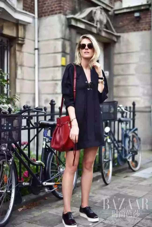 雪紡材質的輕柔連衣裙搭配酒紅色的水桶包實在是迷人,整個look都看起來非常仙氣優雅