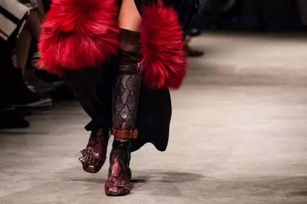 海報女郎。A字裙飾以狐貍毛下擺。錯視絲絨包袋與山羊皮及膝靴。柔軟的皮革拼接帽。