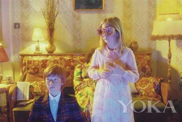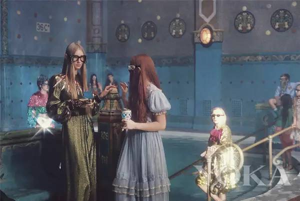 Gucci這不是第一次在眼鏡上發(fā)力了,之前的2017春夏季眼鏡系列還請來了藝術(shù)家Petra Collins加盟,為其專門打造了一支短片。在Petra創(chuàng)造的亦真亦幻的奇妙世界中,一對表兄妹趁著祖母酣睡,偷偷戴上了祖母的眼鏡,驚喜地發(fā)現(xiàn)所有東西都變得癲狂而炫酷,農(nóng)舍的窗欞須臾間化作通往夢境世界的大門。兩位少年在超現(xiàn)實(shí)風(fēng)格的異想田園間漫游,最后抵達(dá)一座熱情騰騰的傳統(tǒng)浴場,老奶奶拿著吉他唱起了搖滾,眾人隨著夢幻之曲曼舞,陶醉其中。