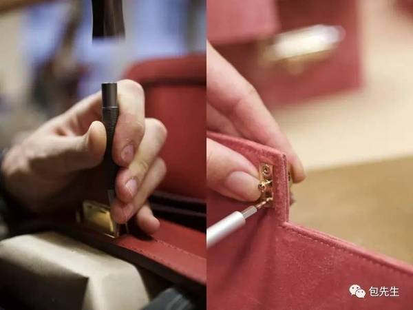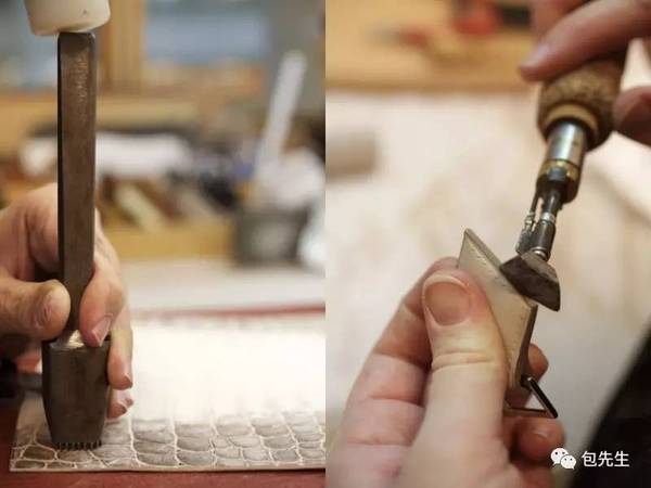 在我們看到的制包的很多環(huán)節(jié)中,我印象最深刻的就是鉑金包包扣那一步。可能我們在用包的時(shí)候都不會太注意到,但是包扣四角圓圓的小突起,其實(shí)不是直接隨著金屬件來的,是為了把金屬扣固定在皮上,之后敲上去的。