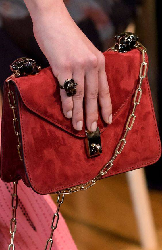 大紅色的麂皮鏈條包,相比較緊密設計的鏈條,粗曠設計的大鏈條,它的重量會輕很多。