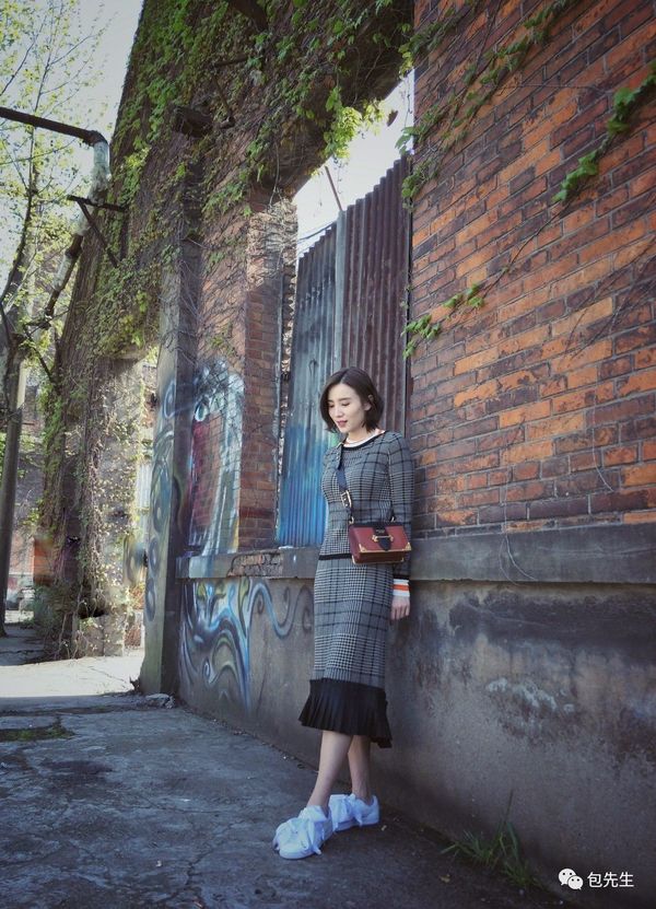 小宋佳這身格紋裙裝搭配酒紅色的Cahier,好復古呀!