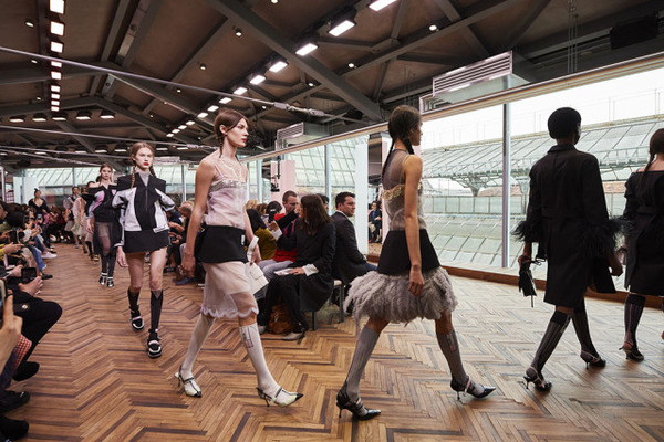 本次大秀的發布地觀景臺位于伊曼紐爾二世長廊的一座主建筑的六層,恰好位于覆蓋于長廊上方的由玻璃和鋼結構打造的穹頂所在位置。該穹頂是Giuseppe Mengoni在1865年至1867年之間打造的。而這場秀,Miuccia Prada從“美好時代(1871-1914)”找尋靈感,這個階段既與秀場地有著時間淵源,又涵蓋了品牌成立之年份,可謂意義雙重。開場的黑色尼龍夾克與、褲裝與裙子,是品牌標志性材質的體現,只是這次并不是以降落傘包的形式出現。這場秀像Prada過往系列的“昨日重現”,透視的蠟筆色歐根紗襯衫及雪紡裙讓打底的衣服顯露,模特兒搭配高筒襪及涼鞋,具有明顯的標志性風格。著名插畫藝術家James Jean的作品再次出現在Prada秀場,上一次出現是在2008年春夏系列中。