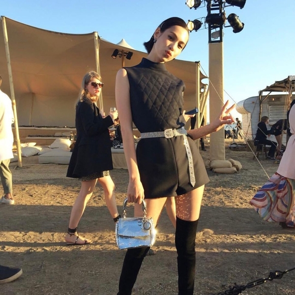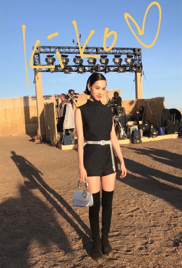 在迪奧2018早春度假秀上,水原希子以一身Dior 2017春夏系列黑色連體褲造型亮相。能“制造”大長腿的短褲、帥氣的半高領設計,都是水原希子日常穿搭時的心頭好。用在看秀造型中,更是游刃有余。在腰間多系一根閃閃的鉆飾腰帶,整個Look立馬綻放異彩,Dior銀色迷你手提包提升華麗感的同時也與腰帶相呼應,秀場模特“黑漆漆”的造型瞬間被她比了下去。在黃沙覆蓋的露天秀場,一雙酷酷的過膝靴自然比貓跟鞋更應景。俏皮又帥氣,如假包換的“水原希子式”風格。