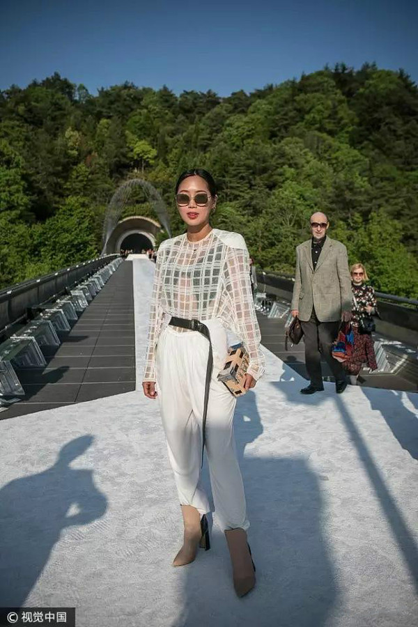 有名的最會(huì)穿衣亞裔博主Aimee Song也亮相大秀現(xiàn)場(chǎng),今天她身著Louis Vuitton2017春夏系列白色褲裝和透視上衣,率性之中透露女人的小性感。