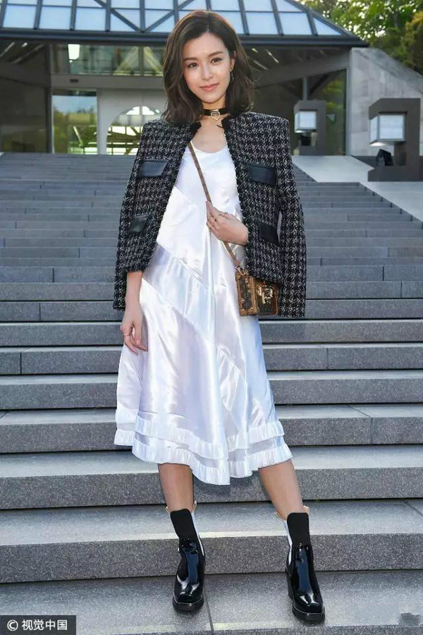 文詠珊毛呢千鳥(niǎo)格夾克內(nèi)搭白色真絲連裙,不同材質(zhì)相互碰撞充滿個(gè)性不失女人味。
