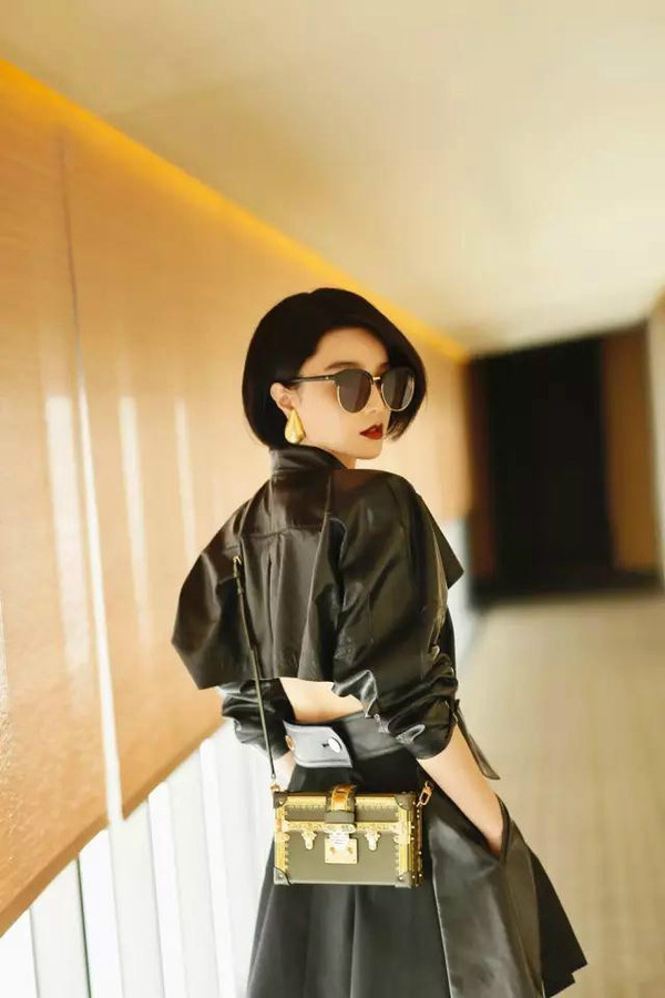 范冰冰一身Louis Vuitton2017春夏系列亮相秀場(chǎng),黑色硬挺的皮質(zhì)上衣搭配小黑裙,以及黑色尖頭靴,非常帥酷,紅色唇妝在黑色的襯托下格外迷人性感。