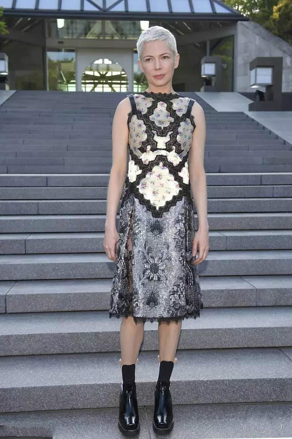 《斷背山》女主Michelle Williams穿Louis Vuitton2017秋冬系列連衣裙亮相秀場(chǎng),帶有濃濃的東方味道的裝扮更應(yīng)時(shí)應(yīng)景,搭配長(zhǎng)靴再帶來(lái)一絲率性。