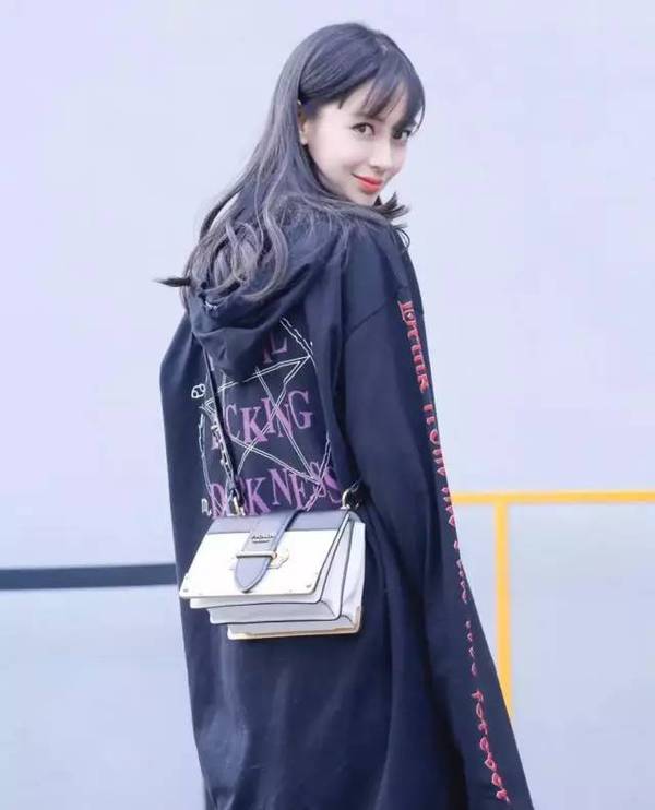 這么火的單品怎么能少得了“帶貨女王”大冪冪的蓋章認證,身穿改良B-3夾克,搭配不規則褲腳緊身褲和漁網襪,斜挎寬肩帶Prada包,又一次賺足回頭率。