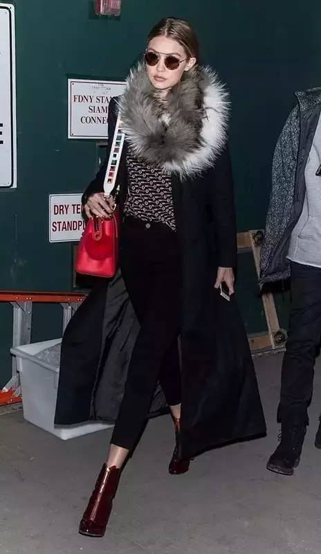GIGI的黑色大衣搭配紅色包包,使整體造型不那么單調,瞬間氣場全開啊。