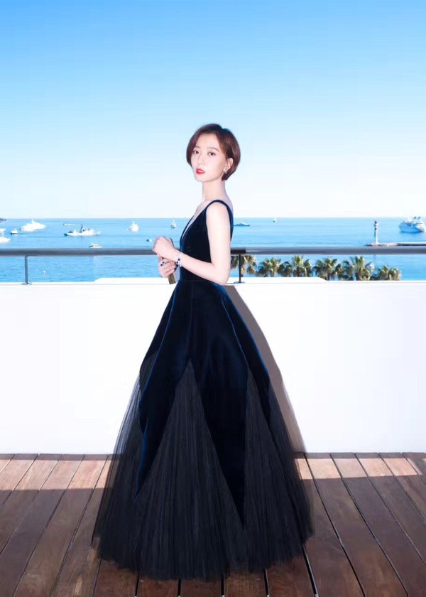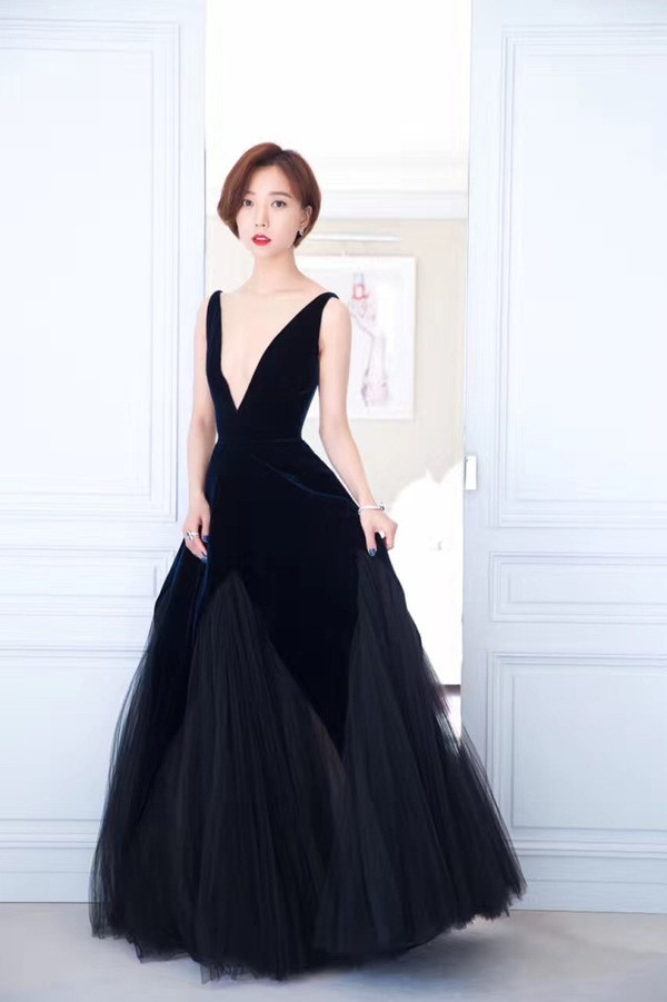 深V的黑色禮服加上王珞丹干練的短發,把頸肩的完美線條展露無遺,收身的禮服在下擺配以層疊黑紗讓人看起來更加優雅大方。