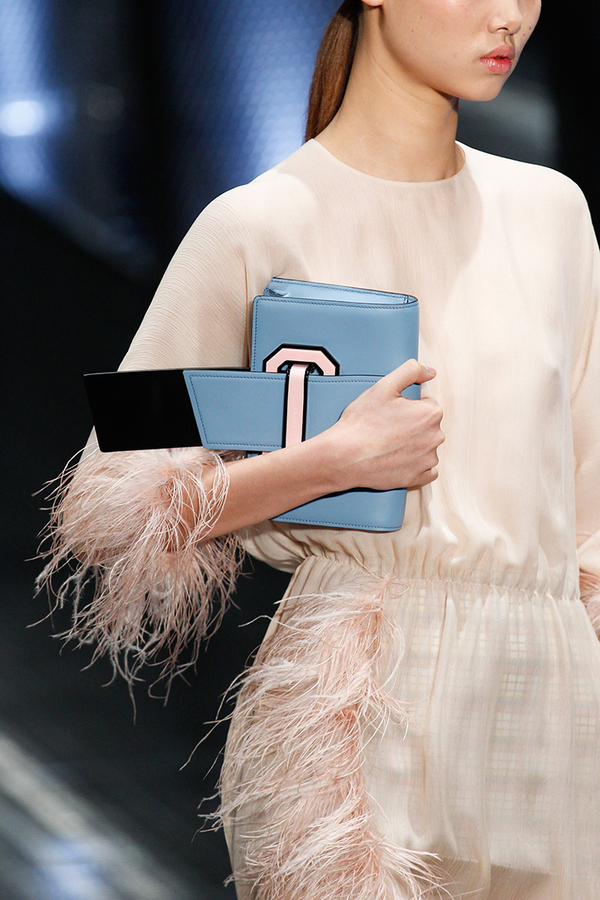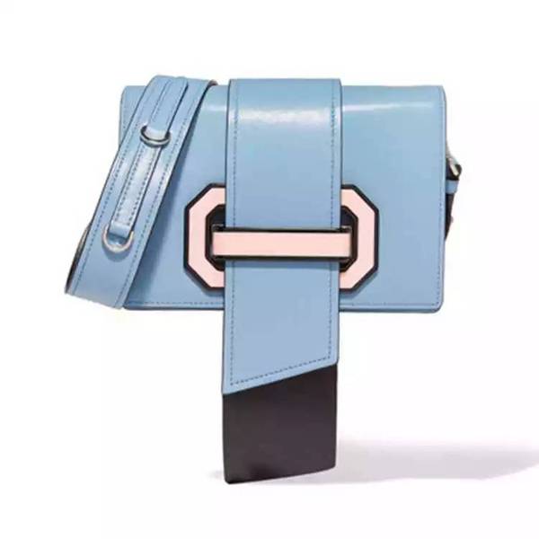 普拉達2017春夏秀場細節,淺藍色皮革、粉黑拼色搭扣“Ribbon”皮革單肩包