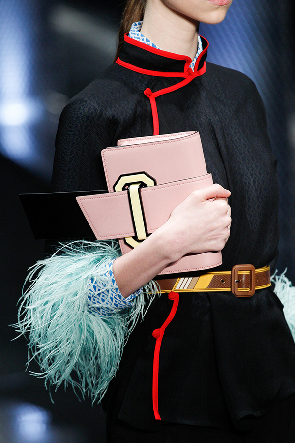 普拉達2017春夏秀場細節,淺粉色皮革、黃黑拼色搭扣“Ribbon”皮革單肩包