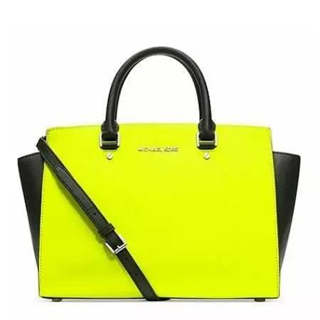 Michael Kors/MK邁克.柯爾 熒光黃拼黑色十字紋牛皮塞爾瑪拉鏈MK大號手提包
