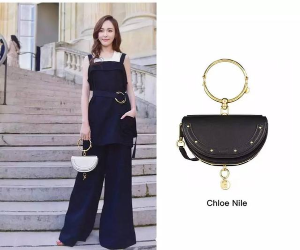 同屬Nile系列,楊冪選擇黑色的馬鞍形包包,大氣簡約;唐嫣選擇白色半圓形包包更加小巧輕便