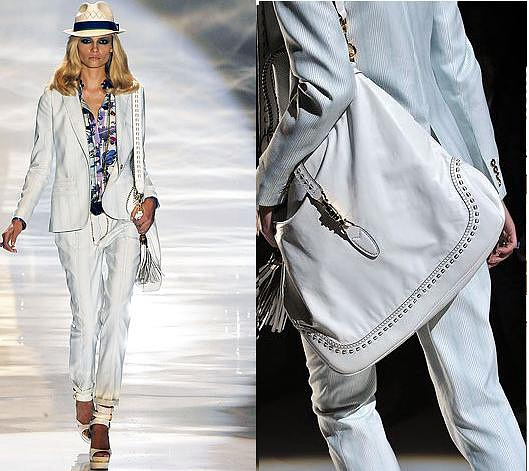 12 .Gucci的Jackie也是經典不敗的款式,不是露珠喜歡的那種傳統的方正形,但是感覺很是摩登,適合那種很有power的都市女性.楊冪和全智賢都背過Jackie Soft.途中模特一身西裝套裝,背著長帶子的New Jackie,很有氣場,適合職場女性模仿.