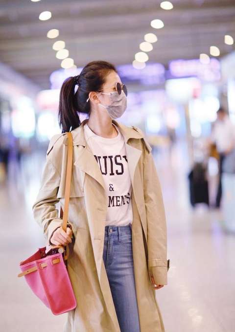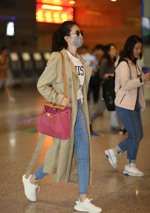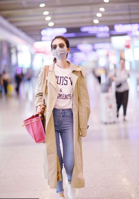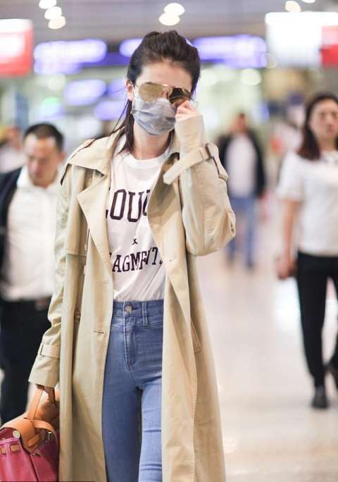 可能由于深夜氣溫較低的緣故,喬欣外套一件米色長風衣,內搭一件白色t恤,下身穿牛仔褲,這身穿搭還是很有星范的!