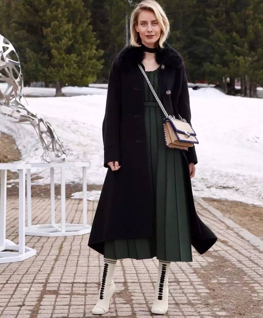 帥氣的黑外里面配上長裙,造型干凈利落。