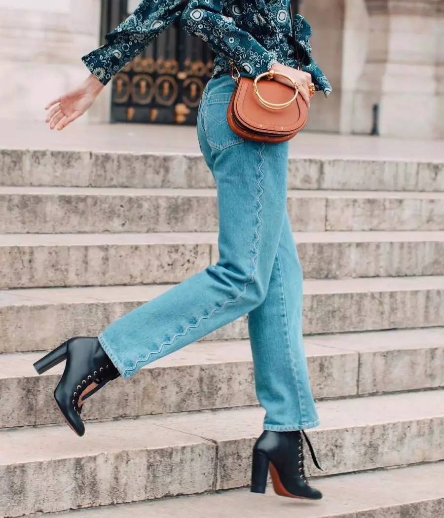時尚的深藍色上衣配下面經典藍的牛仔闊腿褲,