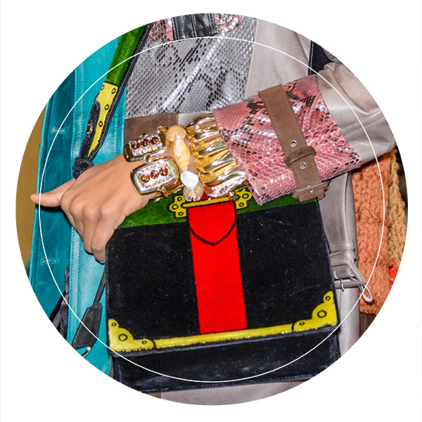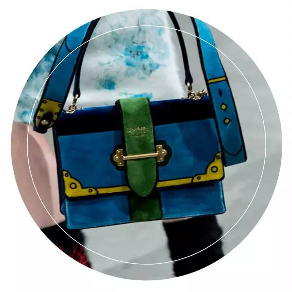 新款的Cahier Bag將扣帶和金屬邊角畫在了天鵝絨的包身表面,華麗與趣味結(jié)合的十分完美,絲毫不會(huì)感到低俗廉價(jià)。再加上Prada拿手的彩色碰撞玩法,簡潔的筆觸線條讓包包更具藝術(shù)感。