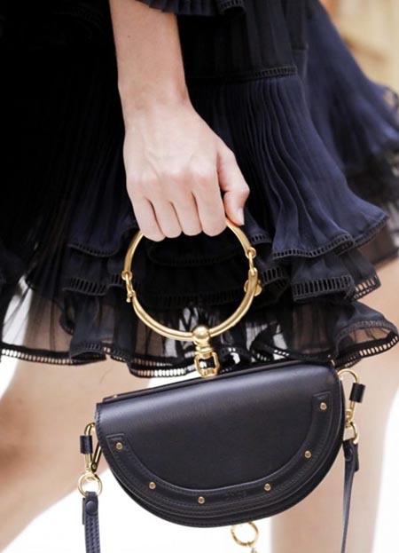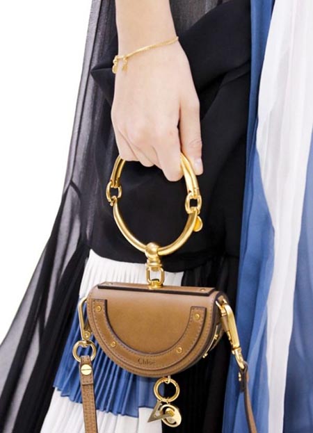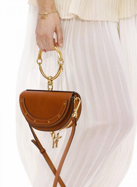 源自手鐲系列的金屬圓環(huán)規(guī)劃,由兩個(gè)半圓形鑲嵌構(gòu)成,是Chloé 2017春夏手袋系列中最搶眼的元素,運(yùn)用在Nile手袋以及別的Faye后背包、肩背袋等包款上,容易就成為擄獲眼光的亮點(diǎn)。