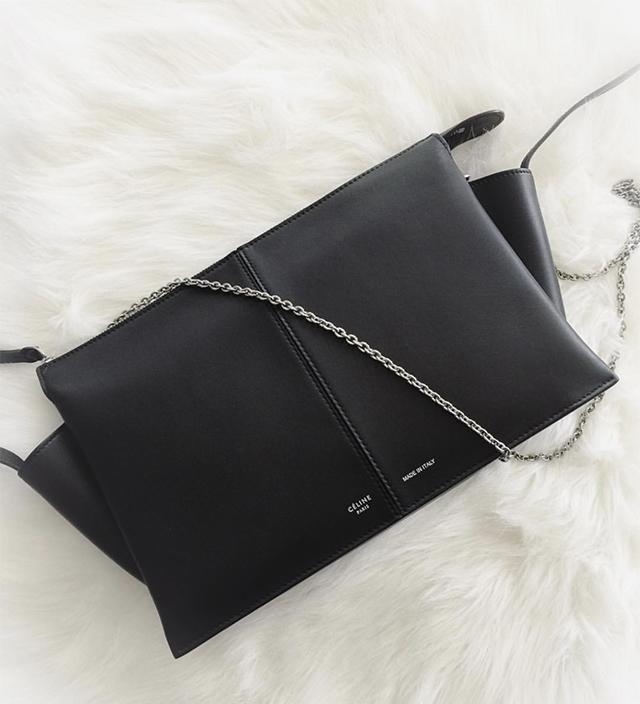 也許Celine格外喜歡這種有兩條胡須相同的帶子規(guī)劃,顯得格外有感覺。Tri-Fold能夠說是Celine一切包款里最低沉的一款了,秋千包和鯰魚包的結合,秋千包的外形和鯰魚包的“魚須”,也是別有一番滋味呢!