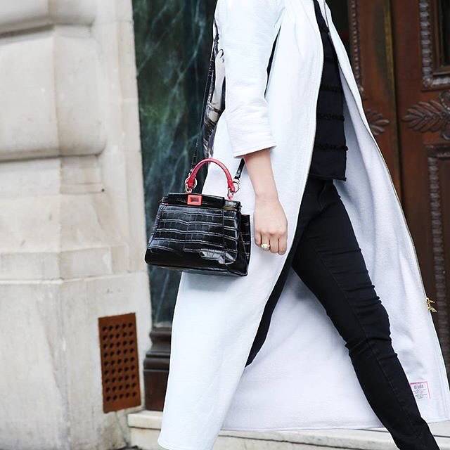 Peekaboo最早出的款式都是純色的小牛皮,今年春夏開始出了一些花樣比較多的。手袋里面有兩個夾層,還有個肩帶,可以拆卸也可以調節,不過比較流行的背法是敞口手拎。