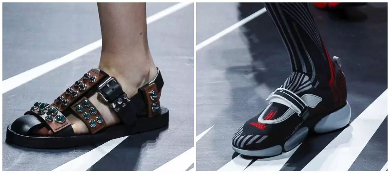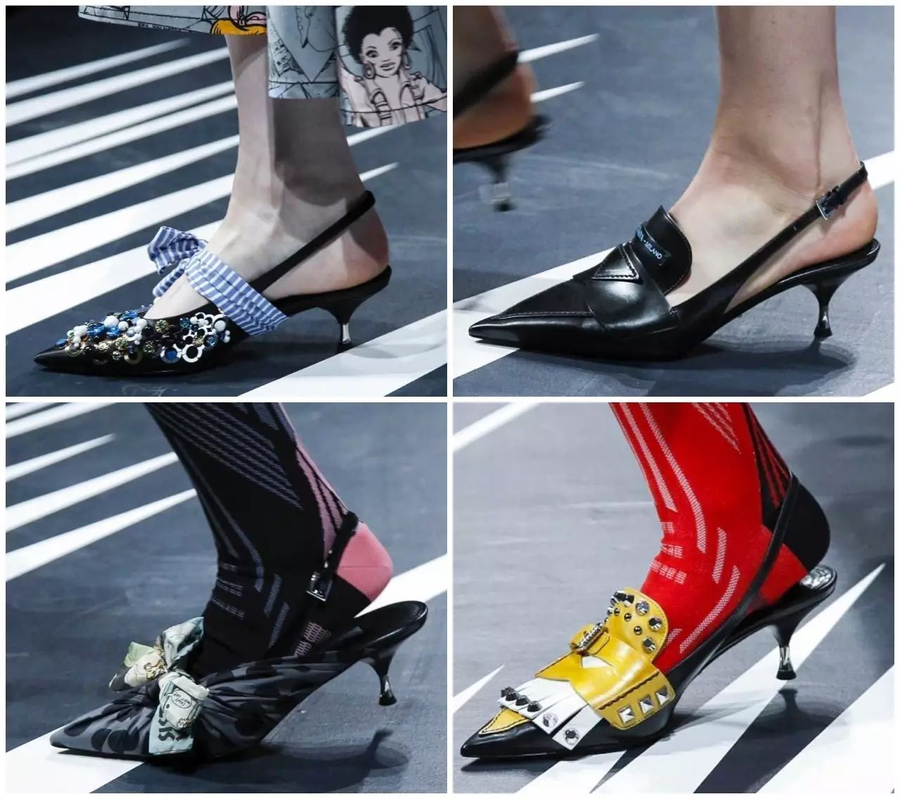 尖頭貓跟鞋、平底“丑涼鞋”成為了秀場主角,并以鉚釘、流蘇等裝飾,舒適度提高的同時,也側面透露出解放女性的意味。