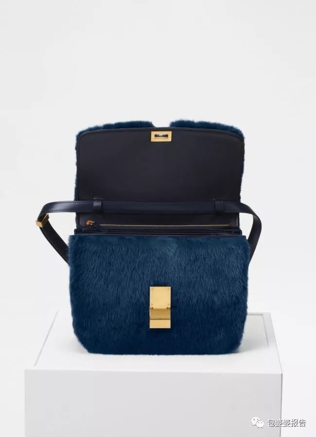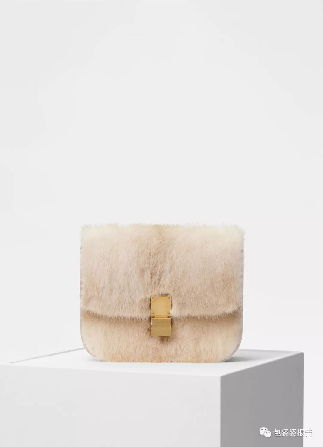 Céline 的Classic 包款系列人盡皆知,是真正能經受得起時間考驗的「經典」,近日 Céline 更為這款小方包加入了皮草元素。推出全新Medium Classic In Mink ,採用貂皮、羔羊皮、牛皮材質打造的Classic Box 提供深藍色與米色兩款,售價也比同樣中等尺寸的Classic Box 貴了近一倍。其中貂皮內襯的面積達到了24 厘米×18 厘米,打開包袋能發現一個寬敞的雙層扁平區域,內置拉鏈口袋,可為貴重物品提供額外安全保障。