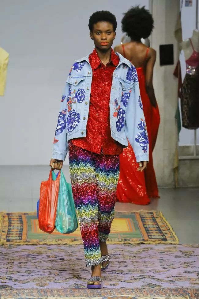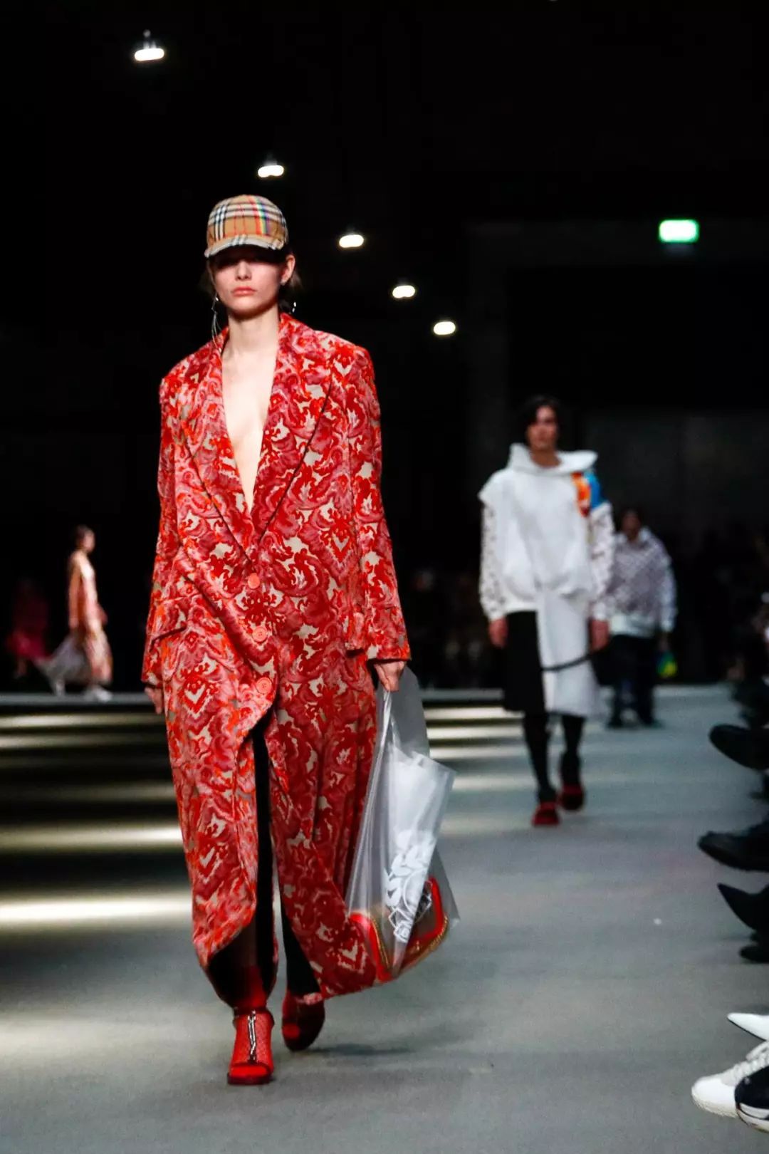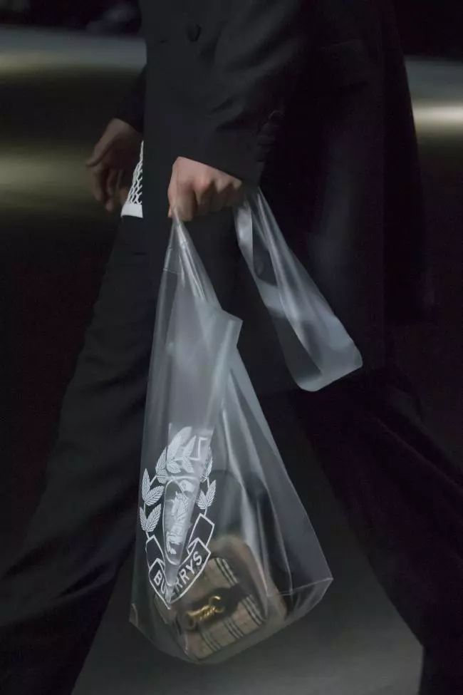 剛剛以霓虹主題吸睛無數(shù)的Burberry2018秋冬秀場上,模特們也是提著不少塑料袋就走秀了。