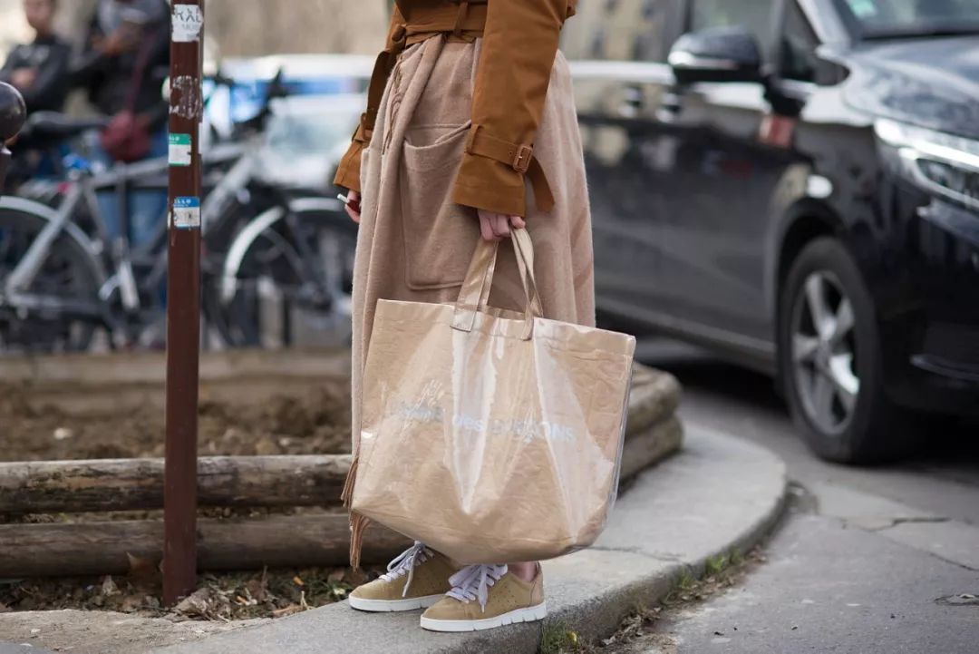 記得這只也引起過哄搶的CDG牛皮紙PVC購物袋嗎,如今拿出來用也正是時(shí)候。復(fù)古的牛皮紙色,也是很好搭配的。