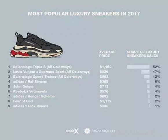 在Highsnobiety發(fā)布的2017年最受歡迎的奢侈品球鞋排行榜中,Balenciaga的“老爹鞋”Triple S在價格和銷售比例中均位列第一。 然而,日前卻被證實這款網(wǎng)紅鞋的制造商已經(jīng)從意大利搬到了中國福建莆田,是名副其實的“莆田貨”,但是鞋款定價依舊是850美元。在發(fā)售鞋款時,Balenciaga官方門店并沒有將中國制造的信息透露給顧客,并且仍然在使用意大利制造時期拍攝的產(chǎn)品大片。