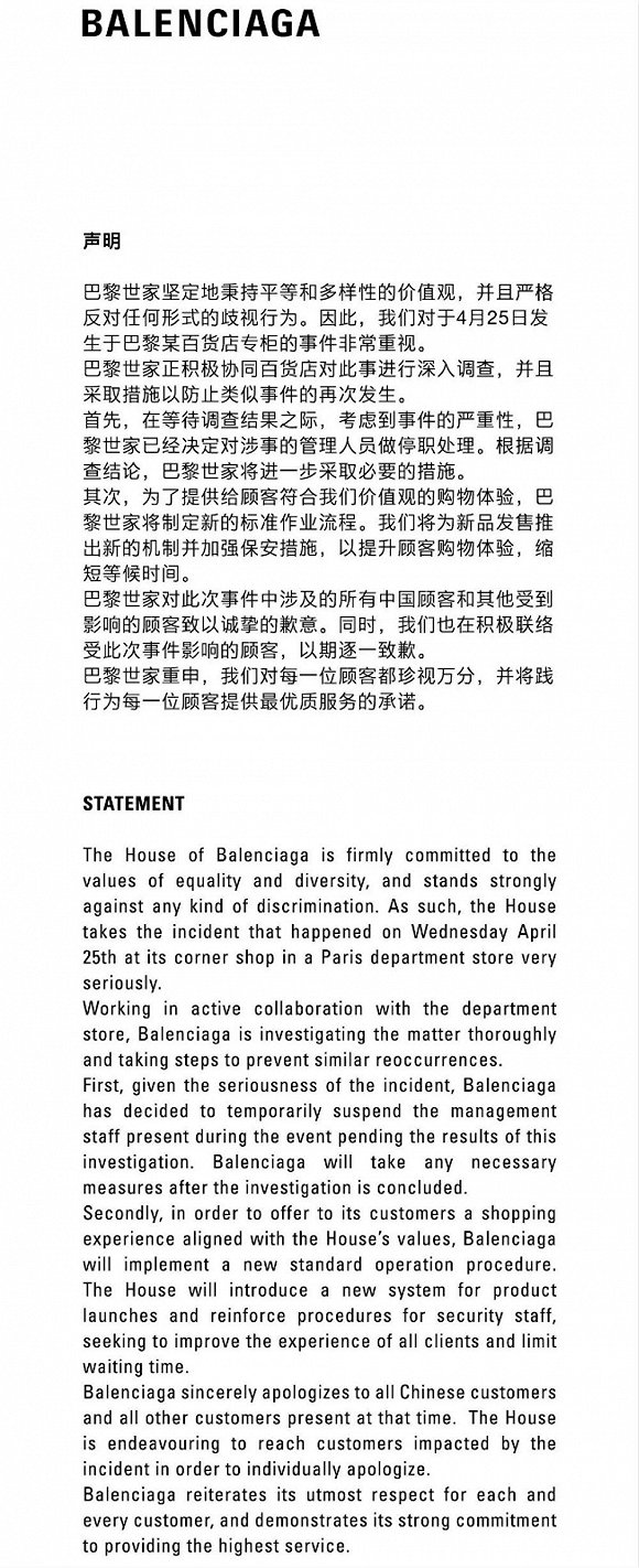 Balenciaga官方微博和官方微信于26日發(fā)布中英文聲明,表示“我們對所有受到影響的客人致以誠摯的歉意,我們重申并將確保始終秉承平等和尊重的態(tài)度面向每一位顧客。”然而,網(wǎng)友并不買單這樣的聲明,被指責(zé)是“敷衍了事”、“格式化的聲明看不出道歉的誠意”、“沒有向大眾交代事情發(fā)生的情況和處理結(jié)果”。