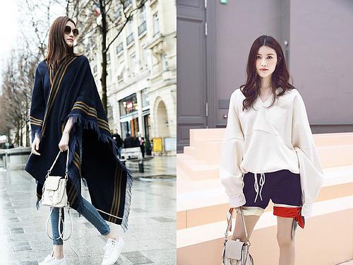 仙姑何穗在參加Chloe巴黎秋冬時裝秀期間以一襲藏青色條紋斗篷搭配Faye迷你雙肩包現身巴黎街頭,清新率性;而在看秀時則換成白色廓形上衣搭配拼色短褲,隨性法式風范