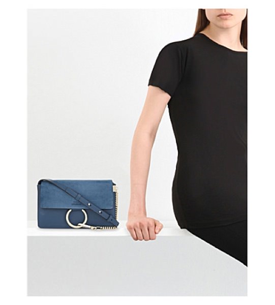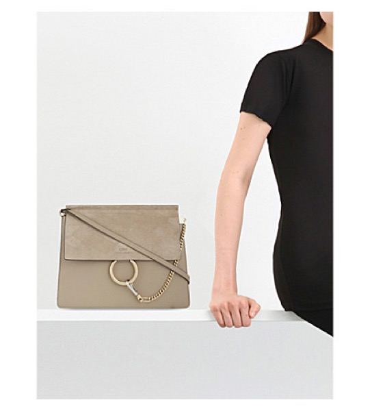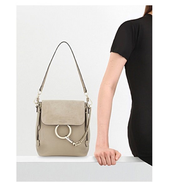 Chloe Faye包有分尺寸,一款比較大的(Medium Faye bag)以及小的(Faye small leather shoulder bag)、和一款更小的款(Faye leather & suede clutch),也有后背包(backpack)。以下我找有真人搭配比較能看出比例的圖。