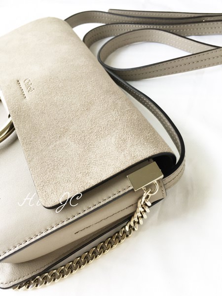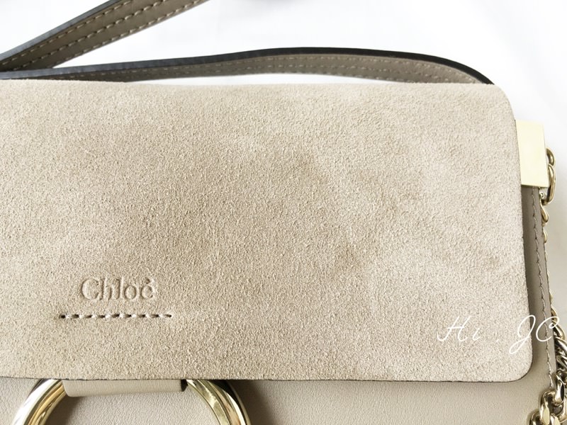 這一款是麂皮混搭小牛皮。包包蓋上Chloe的字體是烙印的,非常低調。