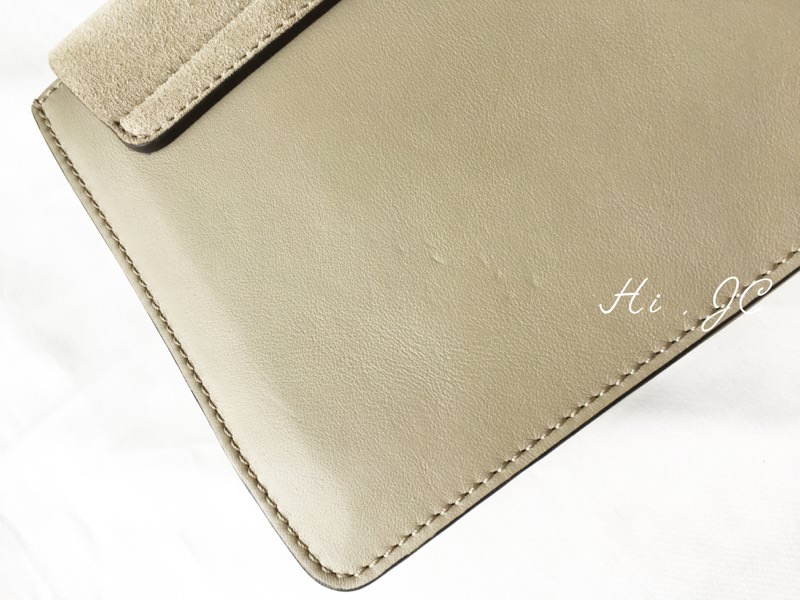 這篇根本都是在講Chloe Faye包的好話?Chloe Faye是真的很美,但也不是完全沒有缺點……剛才說過的麂皮保養問題,真的需要多費心,還有這個Motty Grey的氣質灰如果不小心弄臟可是會變成灰頭土臉的灰灰灰。拼接的小牛皮部分,雖然說應該比麂皮好照顧,但是也不是那種堅固到像堡壘那種,請看下圖~可能是指甲?或是什么尖尖的物品留下的痕跡~