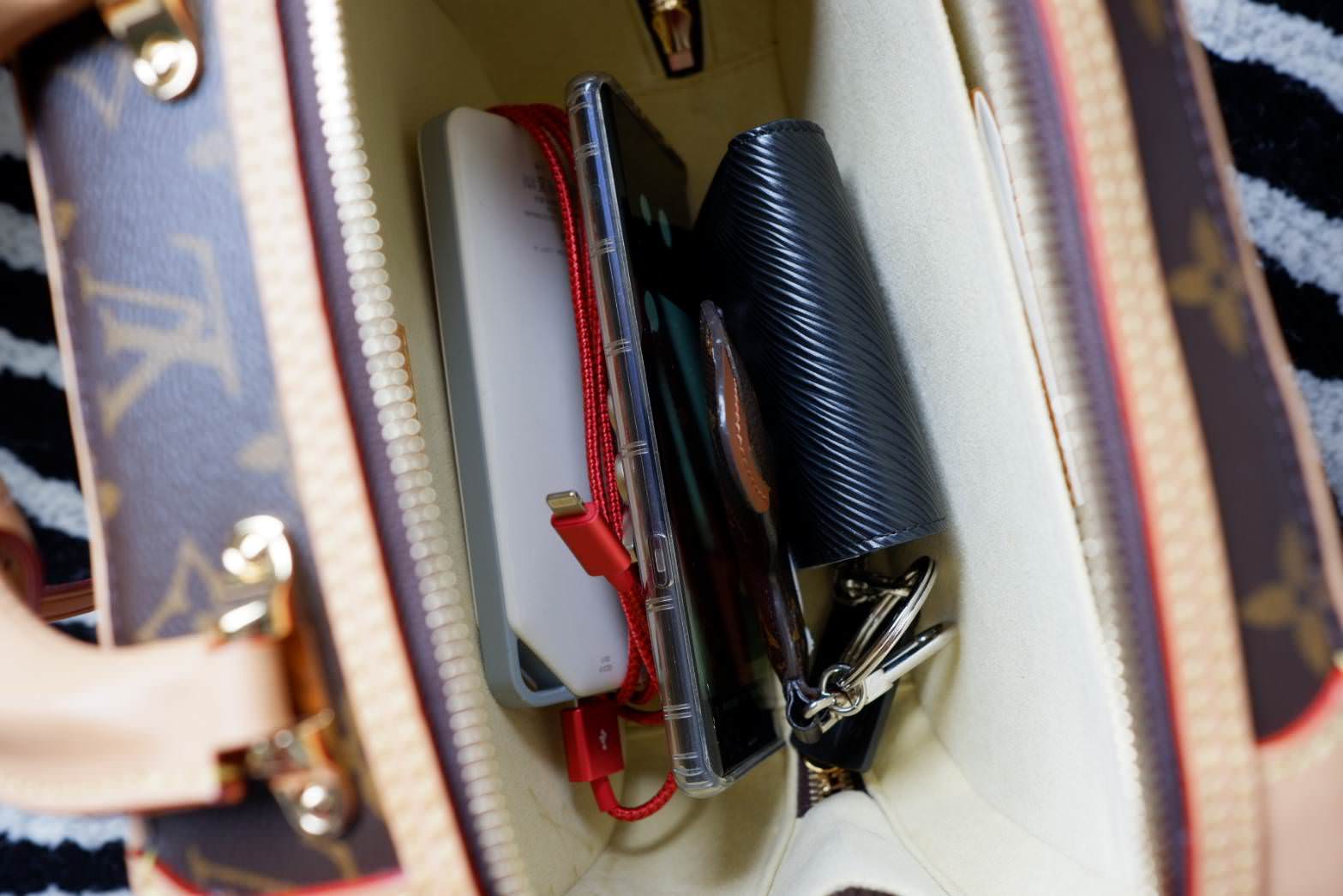 這樣吧,我的Note9,大顆行動電源,小錢包和鑰匙放進去以后感覺蓮底部都還沒有鋪滿。我的類單眼相機要放進去也是沒有問題的,這個容量真的很討喜。一般大容量的包都比較沒有造型。mini luggage在這方便倒是滿足了兩種需求。想要背出去有型,可是又無法割舍眾多家當的女孩們必買。。ㄒ驗槔锩鏇]有隔層,所以比metis 郵差包還好放一些大體積的東西!)