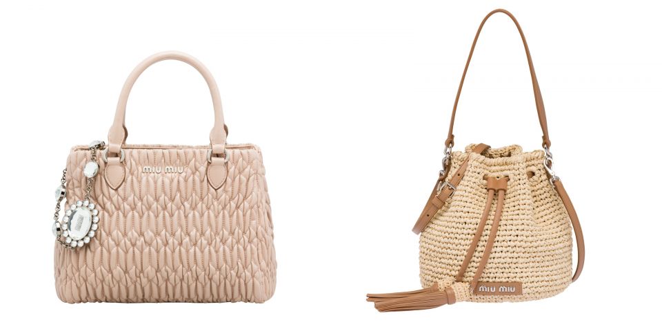 MIU MIU最最經典的Miu Crystal包,抓皺材質是一眼就能辨出的特色,新的米色加入金屬飾帶綴以水晶,以及可拆式納帕軟皮飾帶,讓包包的甜美與華麗度升級;MIU MIU編織水桶袋配備肩帶,使用拉菲草和小牛皮打造,底部飾以皮革拼縫細節,正適合夏天的清爽氣息。