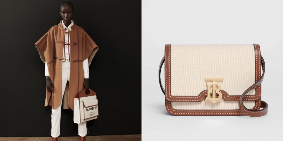 Burberry 2019秋冬Pre-Collection以Burberry的經典米色為主要色調,在形象照上可看到模特兒提著如信封外形的米色托特袋,上面印著BURBERRY的創立年代,簡單的設計卻令人印象深刻,而另一款迷你雙色調帆布及皮革TB包,使用雙色調帆布及光滑皮革包,質感硬挺立體,采用Thomas Burberry 花押字鎖扣設計,可以肩背、斜背或當作手拿包使用。