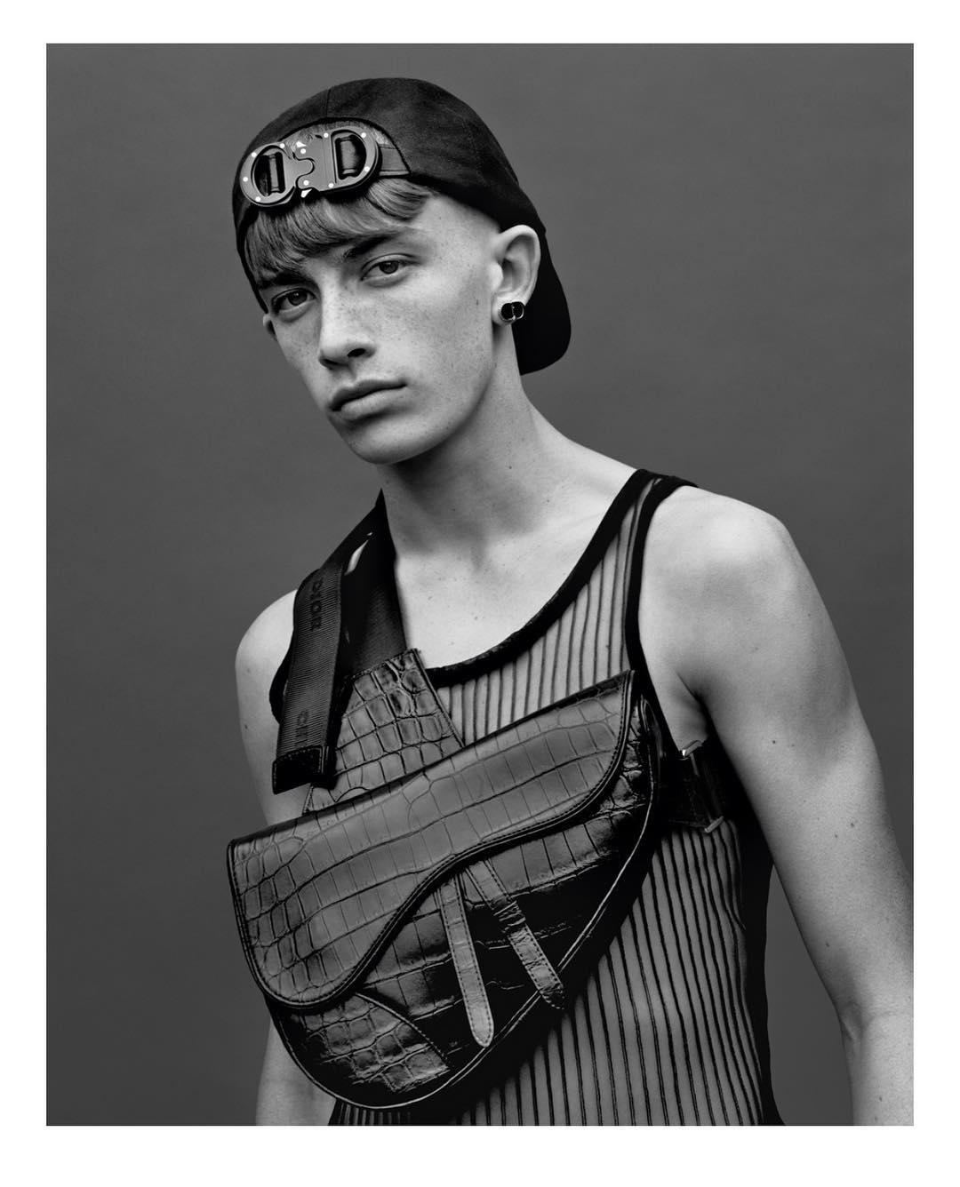 攜手雜志《iD》拍攝的黑白照中,纖細年輕的男孩,胸口背了一款鱷魚皮壓紋包款,從外形上我們馬上就能得知他就是Dior 的馬鞍包Saddle,比起初次發表的小型腰包款,這次的男生版Saddle 胸前側背的特性,他整體更具有隨性街頭的感覺,但同時保持優雅的樣貌。