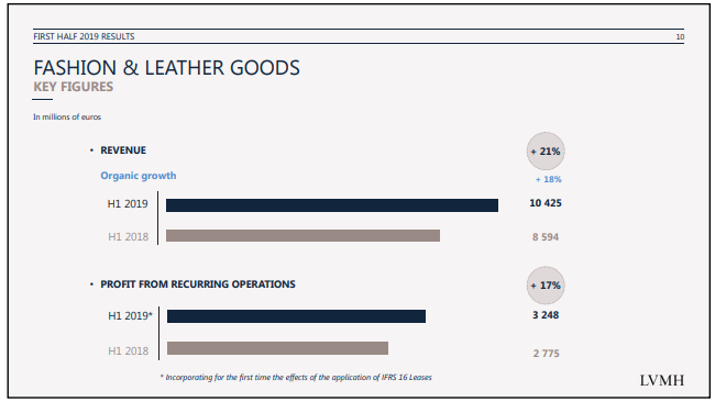 據(jù)時(shí)尚商業(yè)快訊,在截至6月30日的上半年內(nèi),全球最大奢侈品集團(tuán)LVMH銷售額同比大漲15%至251億歐元,毛利率為66%,營(yíng)業(yè)利潤(rùn)增長(zhǎng)14%至52.95億歐元,凈利潤(rùn)則增長(zhǎng)9%至32.68億歐元。LVMH時(shí)裝和皮具部門上半年銷售額在Louis Vuitton和Dior等奢侈品牌的推動(dòng)下大漲21%至104.25億歐元,創(chuàng)下歷史新高。