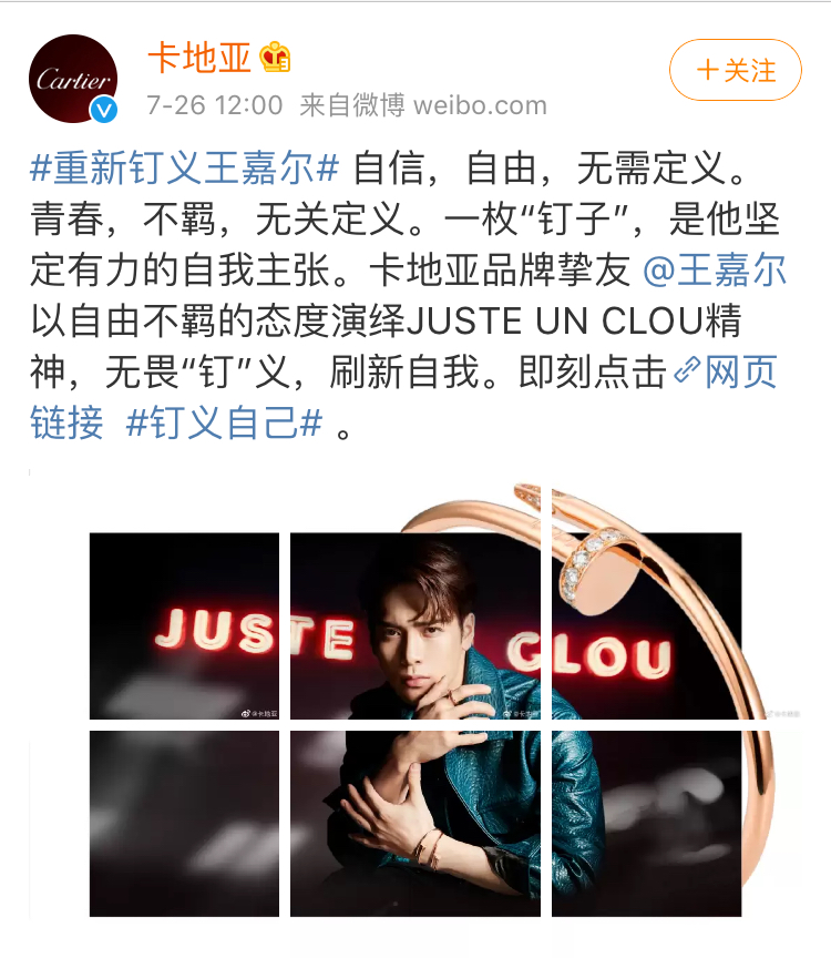 幾位小鮮肉也在本周收割身份——卡地亞官宣王嘉爾為品牌摯友;憑借熱播劇《陳情令》人氣更上一層樓的王一博正式成為珠寶品牌#EMPHASI艾斐詩# M「冠」系列首位代言人;謝瑞麟珠寶則官宣徐正溪成為品牌摯愛大使。