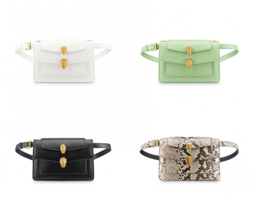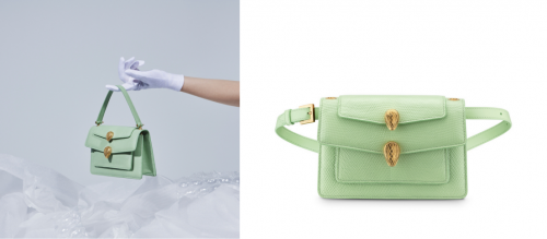 該系列主打單品是帶有兩個蛇首搭扣、兩條可拆卸肩帶和一個可拆卸手柄的Belt Bag,可纏繞于腰間、斜挎或單肩背,變幻出各種創意造型。此次寶格麗與Alexander Wang合作系列更推出中國限定款,薄荷綠色蜥蜴皮外觀,多種佩戴方式,將百變造型演繹成你的“獨家記憶”。