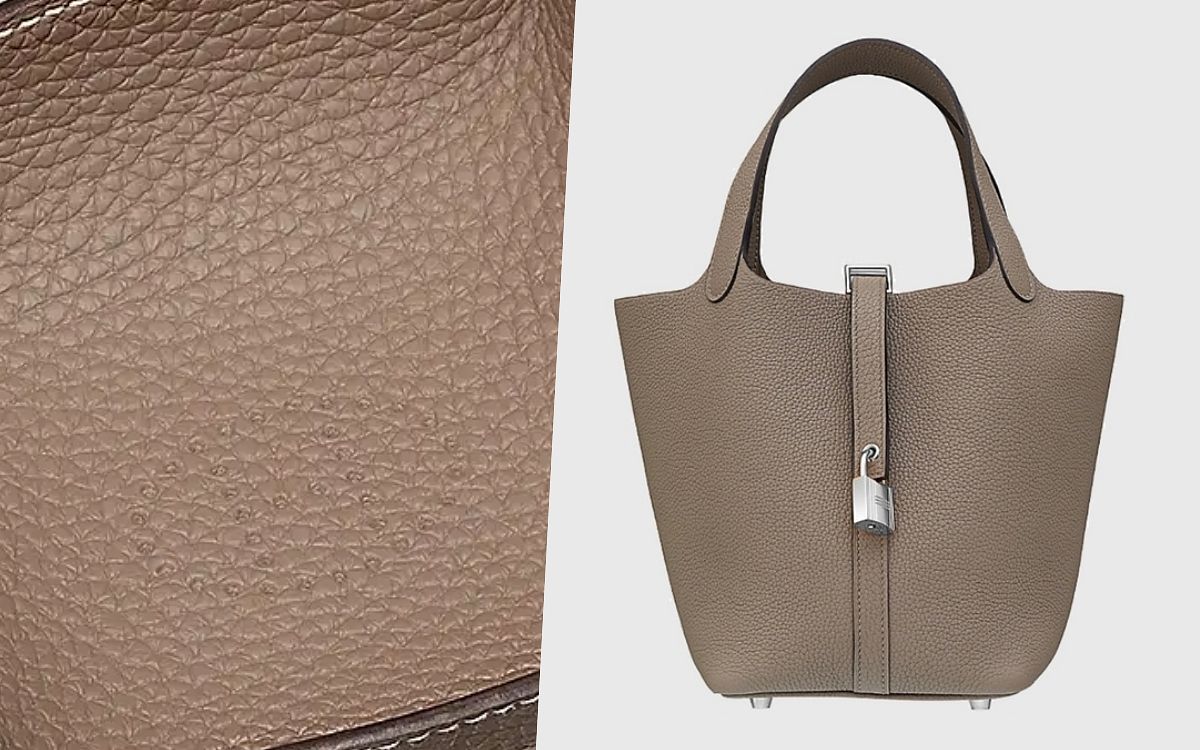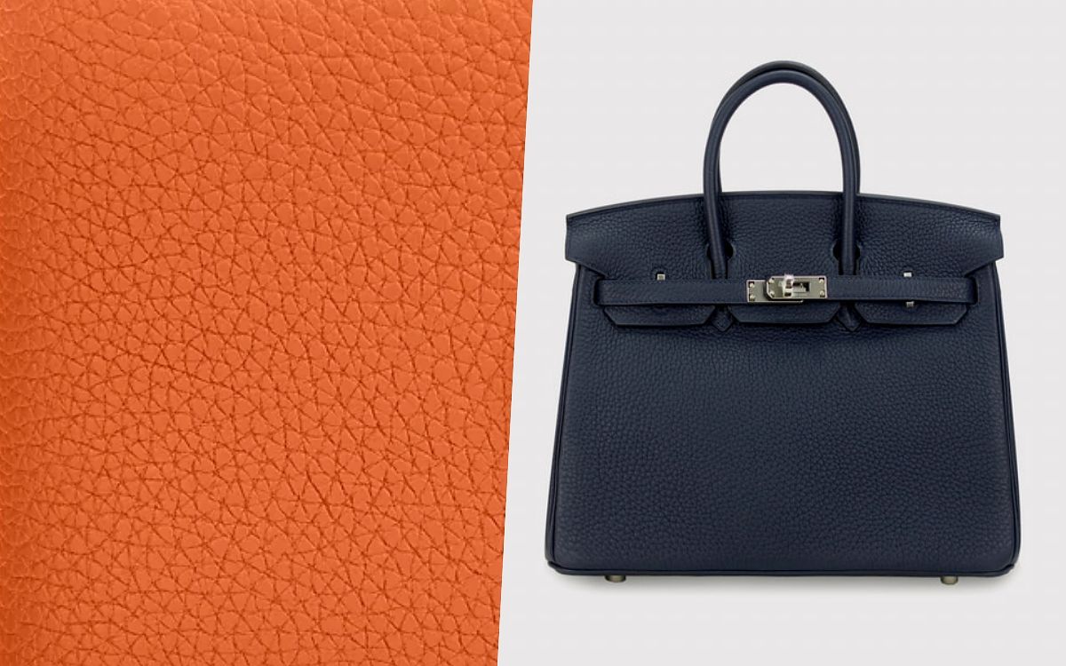經常被拿來與Togo皮革比較,雖相同為小公牛皮革,但顆粒紋路較大且扁平,沒有Togo那么厚挺,手感相較更柔軟、難固定包型,經常被使用在Picotin類型包款,但皮革防水性較低,碰水容易有水印、起泡。
