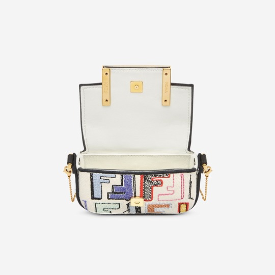 Nno Baguette 掛飾精巧玲瓏,采用翻蓋設計,配有超大金屬FF磁扣開合。采用夾扣設計,可掛在更大的手袋或腰帶上,圓環手柄也用來手提,可以放入耳機、鑰匙等隨身小物。