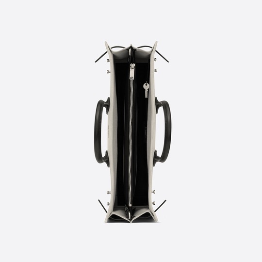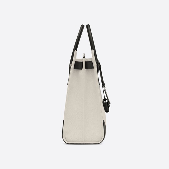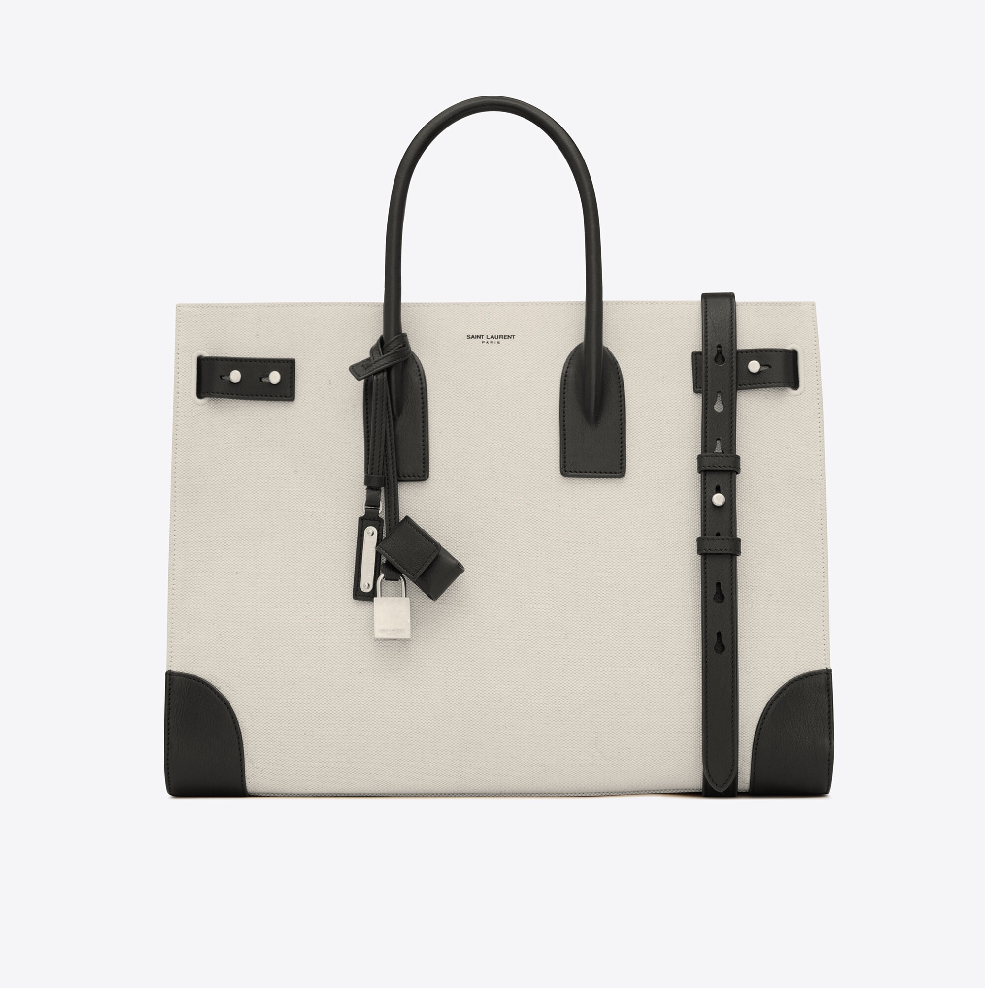 SAC DE JOUR 手拎包以輕盈舒適的原色帆布制作,亮點是運用黑色皮革制作包角、提手、側面綁帶等細節,包口飾以微小的徽標字母,整體風格極簡有型,流露出撞色美感。